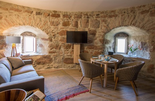 Das Apartment gliedert sich in ein Schlafzimmer mit Doppelbett und einem Wohnzimmer mit Küche. Zwei separate Bäder sorgen wie ausreichend Privatsphäre. Das Apartment verbindet den historischen Charme 500 Jahre alten Natursteinmauerwerks mit einer modernen und hellen Einrichtung.