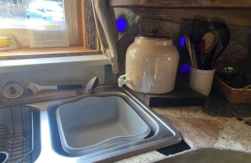 The cabin has minimal water with very low pressure for washing dishes and showering but does not have drinking water. Be sure to bring your own. Containers can be filled up at a sink behind our barn, however this is well water and not treated in any way. We drink this water but we are not supposed to serve it to the public without chlorinating it. The 5 gallon jugs provided for washing dishes and filling camp shower bag can be refilled at the barn. Msg us and we’ll show you.