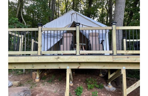 Escape to a peaceful glamping retreat just an hour from Philadelphia. Set on a 16-acre 100-year-old family farm, this furnished tent sits among trees on a wooden deck overlooking an open field.