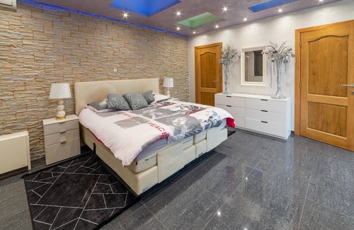 Layout: Ground floor: (hallway, Living room(double sofa bed, fireplace, decorative fireplace), dining room(dining table), Kitchen(electric kettle, cooker, espresso machine, oven, microwave, fridge-freezer), bathroom(shower, washbasin), fitness room(fitness equipment), Bubble bath) On the 1st floor: (bedroom(double bed), bedroom(double bed), bedroom(double bed), bathroom(massage shower, washbasin), Turkish steambath) infrared sauna, air conditioning, terrace, BBQ, BBQ, private indoor pool