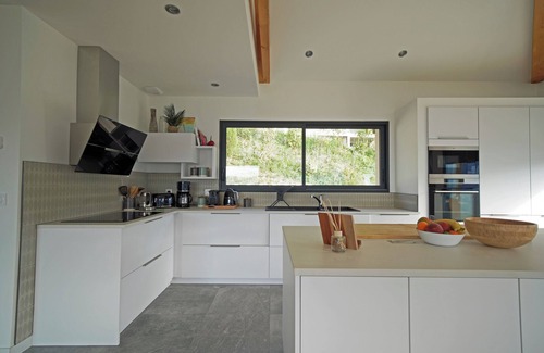 You will find a large, fully equipped kitchen (oven, induction hob, microwave, American fridge, etc.), a laundry room (washing machine, tumble dryer), a large dining/living room, three bedrooms (high quality beds manufactured in Brittany, 160*200), a bathroom with an Italian shower (view on the lake and mountains), a storeroom, a wine cellar, and a separate toilet.
