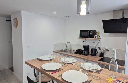 -> A dining area with a fully equipped kitchen (hob, extractor hood, microwave, oven, fridge, toaster, filter coffee machine, kettle, etc.). All cooking essentials are provided. A welcome kit including tea, coffee, sugar, and biscuits is offered.