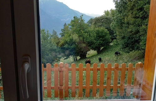 Maison entière avec 4 chambres, une cuisine entièrement pensée et équipée pour votre confort, 2 salles d'eau amménagée en bois et pierres, un salon avec TV, un jardin d'hiver avec piscine chauffée couverte de 4x6 mètres, une terrasse amménagée avec grill et vue sur les belles montagnes des Alpes.