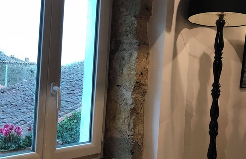 Accommodation - one bedroomed studio for a maximum of two adults. The mezzanine area offers a relaxed seating area with views of the rooftops over La Chapelle Themer.