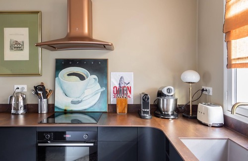 A fully equipped open kitchen: kettle, oven, microwave, toaster, dishwasher, hob.