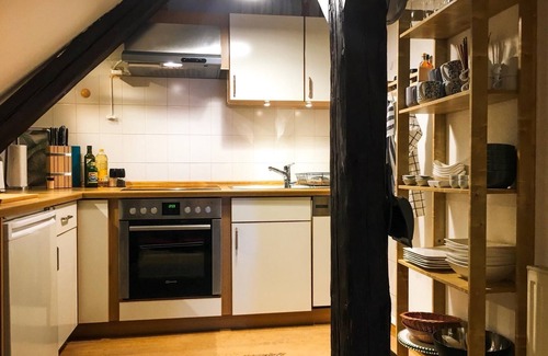 The apartment is located on the 3rd floor of a listed half-timbered building and is only accessible by stairs.