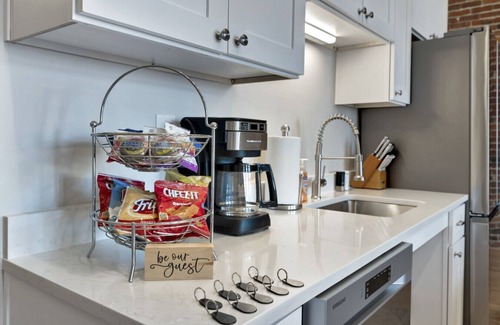 Tucked away in a historic red brick building in downtown Nashville, this spacious new 2022 buildout includes 4 bedrooms, 5 bathrooms, an open concept living room and kitchen that overlooks Nissan Stadium. The chef's kitchen features an oversized quartz island perfect for social gatherings. Each bedroom is a suite with its own bathroom, brand new plush mattress and bedding, and a Smart TV with 85 streaming channels to make you feel right at home.