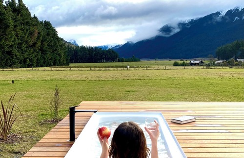 Situated in the picturesque Makarora Valley, just 45 minutes from Wanaka, on the edge of Mount Aspiring National Park, Makarora Bach is a sunny, open-plan house with three bedrooms, two bathrooms, an outdoor bath and fire pit. Set on 2 hectares of level paddocks with magnificent unobstructed mountain views, the house has a fully equipped kitchen, wood burning fire, and sleeps up to six with additional accommodation in a vintage caravan. Bedroom 1 (the master) has one queen bed and an ensuite with amazing mountain views; Bedroom 2 has one queen bed; and Bedroom 3 has two single beds.