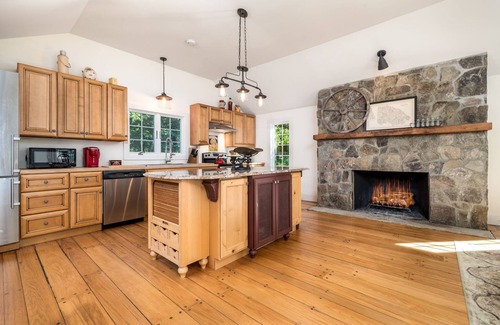 This fully remodeled, light filled, 1900 sqft home includes two working fireplaces, a large Great room, spacious living, dining, and sleeping areas, a dedicated office space, a laundry room, a patio, and a back deck. Its lay-out is convenient, with two bedrooms 2 steps up from the main floor. The bedrooms feature fresh, European style bedding. The twin beds downstairs have new green tea-infused mattresses, the sheets are manufactured by women-owned businesses, and the guest toiletries are all natural and infused with essential oils. Every bedroom has beautiful views of the park-like grounds. The fully equipped, large kitchen with spacious dining area makes it fun to cook and gather, and the private back deck and small front patio are perfect for morning breakfast and evening cocktails! There is fast WiFi and a smart TV in the living room, and, just in case you want to disconnect from it all, a great selection of board games and puzzles, books and magazines. There is also a basket with arts and crafts activities for children. Two functioning fireplaces, one in the kitchen and one in the living room, will bring a special ambiance to your evenings. To start you off, we will supply one deck box full of wood. After that, you are free to collect wood from the property yourself.
