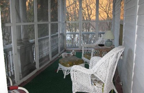 With its own private screened-in veranda, the Mandeville is one of our most popular rooms. It has a queen-sized bed with a private bath inside the room, and an oval-shaped stained-glass window above the bed. The Mandeville is located on the second floor.