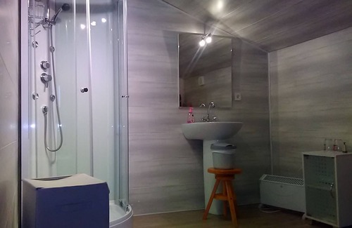 The bathroom is open to the room, to access it, you have to go under the main farm of the house, it is located 1.5 meters from the ground, and gives all the charm to this room