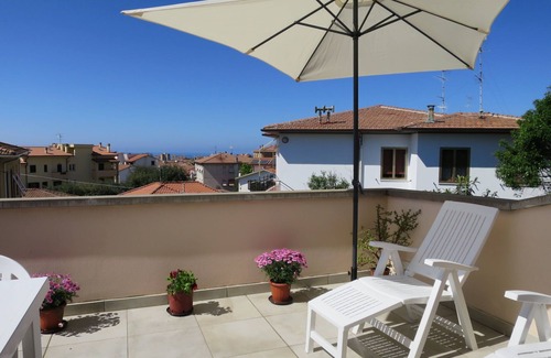 "Mansarda", 2-room apartment 45 m2 on 2nd floor. Practical and modern furnishings: upper floor: (exterior staircase) living/dining room with dining table and satellite TV. Exit to the terrace. 1 double bedroom. Kitchenette (Gas stove, 4 gas rings, toaster, kettle, microwave, electric coffee machine). Shower/bidet/WC. Gas heating. Terrace 12 m2. Terrace furniture, deck chairs (2), box-room. View of the sea. Facilities: iron, baby cot for up to 3 year olds. Internet (WiFi, free). Parking. Maximum 1 pet/ dog allowed. IT049017C2E84RD5L5
