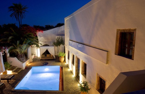 Mansion Sophia, a house beloved by photographers and featured in many magazines around the world, is located in the peaceful traditional village of Megalochori, a short drive away from the best attractions & beaches of the island.This famous mansion was built around the mid-19th century and inhabited by one of the feudal wine-exporting landlords of the island at that time.. Access to the house is through imposing large wooden entrance gates into a secluded and very pretty private courtyard, with garden and a beautiful Moroccan-style swimming pool. There is also a smaller courtyard where the guests can enjoy dining «al fresco» under the Santorini skies. The mansion has been beautifully renovated to provide all modern amenities (air conditioning, satellite TV & Netflix, Sonos Audio System) yet retaining the character and style of the original house.