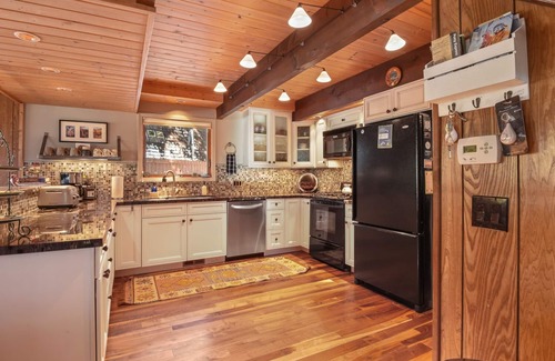 The Manzanita Grove vacation rental is a 3 bedroom/2 bath chalet that features a very open floor plan with the kitchen, living room and dining room open to one another and rock fireplace. The cabin has been very nicely remodeled with wood floors, updated kitchen and bathrooms, and tasteful furniture appointments. In the summer guests can enjoy the expansive front deck area and the property is within walking distance to Watermans Landing and Carnelian Bay. In the winter the cabin is centrally located to Northstar California, Alpine Meadows, and Squaw Valley.