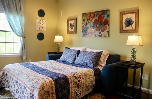 * Burlap Rose: King-size bed with a private bathroom that has a walk-in shower and Jacuzzi tub. Upstairs bedroom. Can easily accommodate a Queen-size air mattress. Sleeps 2.