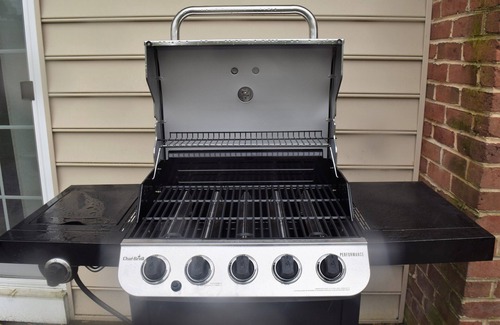 Our home also comes with a fully equipped kitchen, laundry amenities, and gas grill. Dining room with a large table inside and picnic table outside.