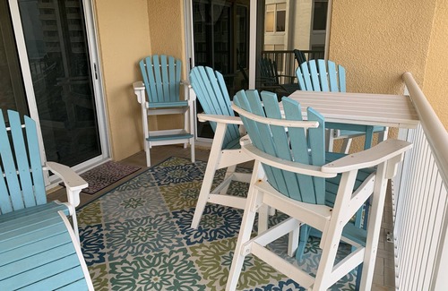*Breezesta balcony furniture including bar height table with 4 chairs, 2 Adirondack chairs with footstools and an accent table on Beachside Balcony.