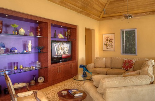 6 Bedroom Suites for the Ultimate in Privacy: Mare Blu has six large bedroom/bathroom master suites, two located at pool level, three on the garden level and one in the pavilion above the grand veranda. All bedroom suites are beautifully furnished, air conditioned hideaways that take full advantage of their picturesque location. All the suites have flat screen televisions with cable. Bathrooms have double vanities, showers, and are tiled in grey granite from floor to ceiling. The Orange suite features an alfresco shower, Yellow a semi-alfresco shower and the Pink suite also offers a bathtub.