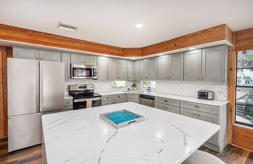 The second floor of the home holds the living room, kitchen, half bathroom, and oceanfront balcony. The second level's open floor plan allows for endless ocean views! The oceanfront living room features a large sectional and flat-screen TV. The dining area is adjacent to the fully remodeled kitchen. The kitchen is fully stocked for all your cooking needs and features additional counter space between the dining area and kitchen.