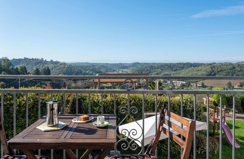On a vinyard "Il Pozzo Fiorito", surrounded by fields and vineyards. 5 apartments in the residence. 100 m from the centre of Cossombrato, 14 km from the centre of Asti, 45 km from the centre of Turin. For shared use: property 1'200 m2 (fenced), well-kept garden with lawn, swimming pool (8 x 4 m, depth 150 cm, seasonal availability: 26.Apr. - 10.Oct.). Shower/WC in the pool area, outdoor shower, table tennis, pergola, terrace, garden furniture, barbecue. In the complex: fitness room (extra). Washing machine (for shared use, extra), bicycles available (extra). Parking at the house on the premises. Supermarket 1 km, bus stop 100 m, railway station "Asti" 14 km. Local sale of farm products. Please note: the owner lives on the same property.