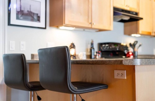 The main level of the apartment contains an open concept kitchen, dining and living room space. The first bedroom, with a full-sized bed, laundry and full bathroom is also located on this level. The kitchen is fully stocked with everything you'll need to create a delicious meal. The living room is also situated so you can enjoy a program on the television or peer out the windows and enjoy the activity downtown!
