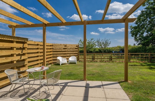 French doors open to a fully enclosed garden with table and chairs and views over the surrounding fields. The bridle path beside the property, which offers a safe easy walk to Winterton, can be accessed via a winding path through the trees.