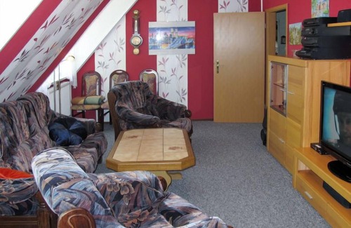 3-room apartment 80 m2 on 1st floor. Practical furnishings: living room with sloping ceilings with satellite TV and hi-fi system. 1 room with sloping ceilings with 1 double bed and satellite TV. 1 room with sloping ceilings with 2 beds and satellite TV. Kitchen (oven, dishwasher, 4 ceramic glass hob hotplates, toaster, kettle, microwave, freezer, electric coffee machine) with dining nook. Shower/WC. Gas heating. Carpet. Patio. Terrace furniture, barbecue (portable), box-room. Facilities: washing machine, children's high chair, baby cot for up to 2 year olds. Internet (WiFi, free). Please note: non-smokers only. Private entrance, smoke alarm. Bookings accepted for holiday purposes only.