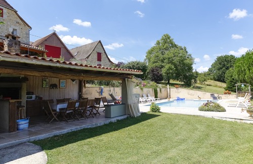 A swimming pool area (10 x 5m heated) with sun lounger and patio equipped with a kitchen bar with dishwasher, a barbecue and a large table with chairs are available, all with a magnificent open view over a wooded valley, conducive to rest and has pleasant moments of conviviality.