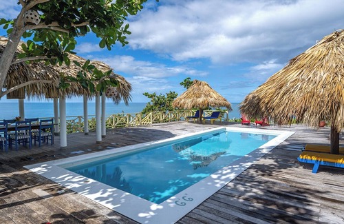 This newly polished villa offers 3 ensuite bedrooms (2 with outdoor showers), living area, TV room, 3 al fresco dining areas, a spacious covered verandah, pool and pool deck with large thatched gazebo with dining table, two small thatched huts, hammock under a large sea grape tree and a hidden scenic overlook area.