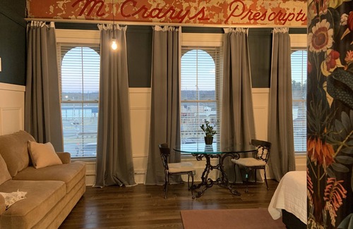 The McCrary Suite is named for the McCrary Family Pharmacy that was here prior to 1967. This suite has a kitchenette area, private bath with walk in shower and private bedroom. 12 foot ceilings and three large, bright windows overlooking historic Main Street elevate the space to first class. Walk to the boutique and antique stores.