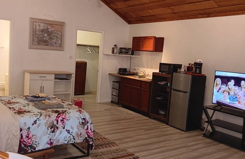The unit is a large and nicely furnished studio; it has a queen-sized bed + bedding, private bath, kitchenette + dishes for 2, 40" flat Roku TV.