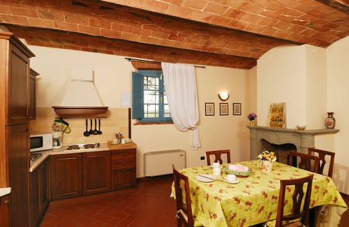 The house is very spacious and has been divided into large and elegant apartments offering 17 bedrooms and 9 bathrooms ideal to accomodate large groups up to 33-36 people .The property has been completely restructured in full respect of the Tuscan architectural style, with the handsome façade in bare stone, the door and window frames in grey sandstone, the roof ventilated with modern technology but made using the ancient tiles, the interior floors in classic red terracotta, the ceilings with great beams in chestnut, oak and cypress, or beams in antique terracotta, the plaster walls tinted in pale hues, the stone stairways, and the original frescoes that decorate some of the ceilings. Community area with oven, grill and a zone equipped with tables and benches for outdoor enjoyment. Large arcade to enjoy meals all together , a professional kitchen to cook yourselves for a large group , panoramic pool and a heated hydromassage pool for 6/8 adults set amid olive trees.