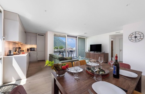 This sleek and modern air-conditioned apartment is perfect for your year-round escapes on Lake Lugano. Inside, it comfortably accommodates up to 4 guests and features a beautifully designed interior with contemporary decor, Smart TV and Wi-Fi access. The kitchen, fully equipped with modern appliances like a dishwasher and microwave as well as features ample counter space, is ideal for preparing meals.