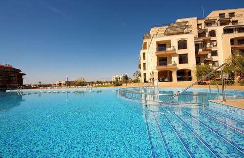 A new, intimate complex located 4 minutes walk from the beach. It is situated between Sveti Vlas and Sunny Beach. It offers a free seasonal outdoor pool and free parking. Right next to it there is a spa center, a large market, restaurants and smaller shops. The center of Sveti Vlas is less than 1 km spacerry. The complex is new, situated in a quiet area, with lots of greenery, space and beautiful views.