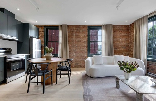 This bright and cozy one-bedroom apartment features high ceilings and large windows that fill the space with natural light. The bedroom offers a comfortable queen-sized bed, an open-concept closet,a safe for secure storage and a fully equipped ensuite bathroom. A dedicated workspace nook in the bedroom provides a quiet area to focus on work.