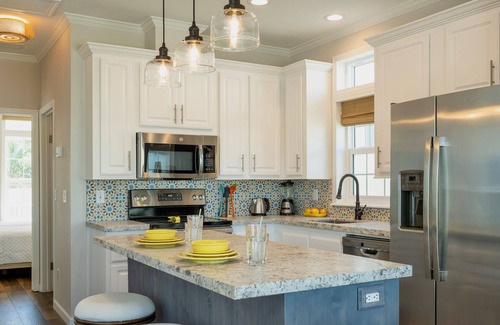 Designed with luxury and comfort in mind, MERMAID MAGIC has a spacious open living area ideal for relaxing after a day full of adventure on the water. The living room features a large flat screen TV and plenty of comfortable seating options. Step outside to the patio and take in the stunning water views. The fully equipped kitchen has all the appliances and tools you’d expect in a high-end rental home. Dining options include an indoor dining table that seats four, two seats at the kitchen island, and a full-size picnic table under the house. You’ll also be able to bring your boat to dock on the 35' concrete seawall equipped with dock posts, cleats, fish cleaning table & swim ladder.