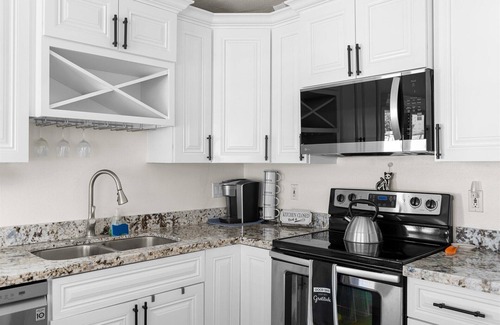Around the corner is a lovely open and modern kitchen. The cook in the group will enjoy whipping up home-cooked meals with stainless steel appliances and plenty of counter space. Prefer to dine alfresco? There is a mini fridge and built-in BBQ outside – the perfect spot to prepare and grill some burgers for the crew.