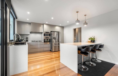 Lower Level: A private lounge room for cozy movie nights, an open-plan kitchen, and a lounge area that opens to a deck with a BBQ and seating area. The kitchen is well-equipped with high-quality appliances, remote-operated blinds, a gas heater, air conditioning, and a beautiful lounge suite.
