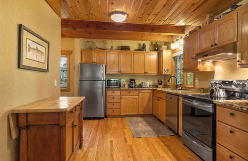 Located in Camp Sherman, this home is part of the charming Metolius River Resort community in the Deschutes National Forest. There's a small general store, as well as a restaurant nearby (as well as 11 other cabins), plus more stores, restaurants, and amenities in the lovely town of Sisters about 15 miles away.Inside, rustic details combine with modern amenities for a comfortable stay. Cozy up on chilly nights next to the wood-burning fireplace, complete with a river rock surround. Watch a show together on the flatscreen cable TV, or hop on the free WiFi to post your latest vacation photos.There's a fully equipped kitchen for all your cooking needs, including stainless steel appliances, a dishwasher, and granite countertops. Grill up your favorites on the charcoal BBQ outside, then enjoy a meal at the four-person dining table.Outside on the deck, there are several Adirondack chairs for relaxing al fresco - ideal for your morning cup of coffee or a soothing glass of wine in the evening. Inside, two bedrooms, one full bath, and a loft space will sleep up to six guests total.Upstairs, there's a full bathroom, a bedroom with a king-size bed, and a second bedroom with a queen-size bed. The loft space has a twin-size bed, plus there's a sofabed downstairs in the living area.When you're ready to head outdoors, the Metolius River is only steps away. This area is well known for its amazing fly fishing and fishing. Whether you're planning a kayak adventure or a serene fishing outing, there's something for everyone.Plan your Central Oregon retreat today and stay at this charming luxury cabin!