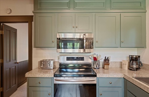 The kitchen, though compact, is fully equipped with modern appliances and a farmhouse sink, making meal prep a delight. Enjoy your creations at the dining table placed by the windows, offering scenic views of the river while you eat.