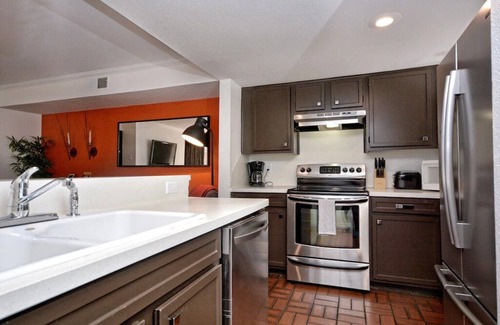 You will receive one reserved parking space in our private and gated complex. Your parking spot is just a short walk to your 2nd floor condo, which sits above a gorgeous landscaped courtyard complete with a fountain. A patio table and chair set offers a place for outdoor relaxation right outside of your door. Step inside to the tile-floored living room and take in the condo’s clean, modern decor. A sofa and armchair offers plenty of comfy seating across from a big flat-screen TV with cable and a decorative fireplace. Large windows let in plenty of sunlight, and the condo’s accents and artwork are the epitome of sleek style.