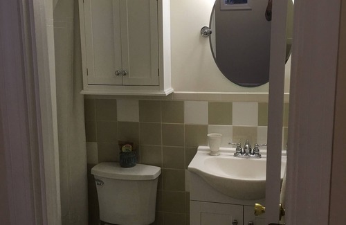The bathroom has everything you would expect: regular sized bathtub and shower, toilet and cupboard, sink and vanity.