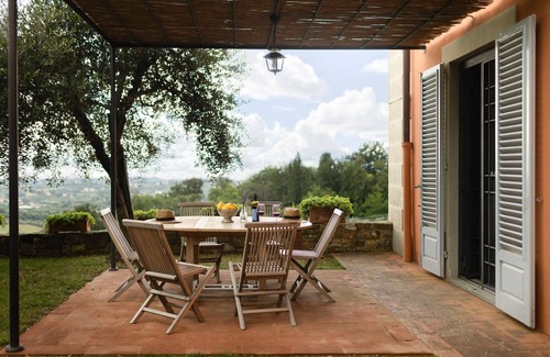 From the cool sitting room, with beautiful vaulted frescoed ceilings, you can access to the private garden, perfect for relaxing dinners outside among olive trees. The large apartment consists of two double bedrooms, two bathrooms with shower, a sitting room with the view of Florence, a dining room with a completely equipped kitchen with refrigerator, freezer, oven, microwave, Nespresso coffee machine and dishwasher.