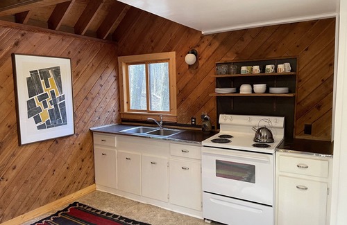 Enjoy a truly secluded lodging experience in this mid-century A-frame design - three season - cabin surrounded by contemporary art and furnishings. The ca. 1970 A-frame style structure is nestled in the rolling hills and stone outcroppings of Tuscarawas County, Ohio. This cabin offers "glamping" at its finest! The structure is a available only in spring, summer, and fall! The cabin is heated only by a wood stove (firewood provided) when needed , and cooled by the updraft design of open clerestory windows and sliding glass doors, plus ceiling fans. The full bath and kitchen with all the modern conveniences make "camping" a luxury!