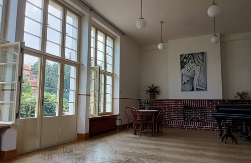 Stay in a mid century villa in a calm and elegant neighborhood of Warsaw. Enjoy great living room with a fireplace, original furniture, great sun terrace and big guest rooms. Each room equipped with a bathroom