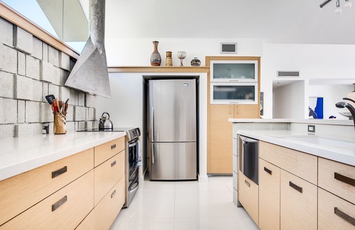 Inside, the home’s signature folded roofline ceilings flow seamlessly through the open living and dining areas, creating an airy and iconic mid-century feel. The updated kitchen includes modern cabinetry, quartz countertops, newer appliances, and even the original 1961 range hood — a perfect nod to the home's architectural roots.