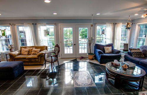 Our large, well stocked 500 sq ft kitchen is centrally located and is often the focus of gatherings and fun. It has an electric stove/oven as well as a gas cook top in a 10 ft long island , and includes two side by side refrigerators; one with an ice maker. In addition, there are 2 other large rooms, a sun room and sitting room, just off the kitchen, and a games room upstairs for our guests to enjoy.