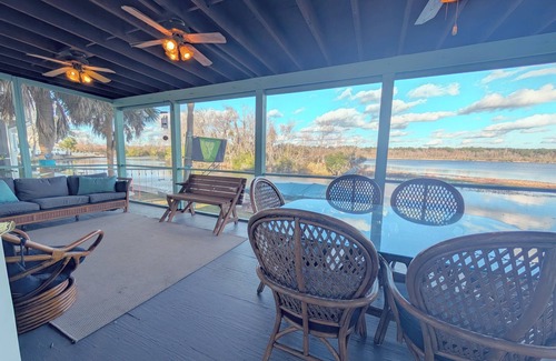You're about to rent a quiet house on the water with a great view of sun and moon rises over the water. Every day here is a vacation. It's nice to just sit and relax on the screened in porches and watch nature, full of wild life. Restoration Hardware furnishings throughout, including Genuine Leather couches stuffed with down feathers.
