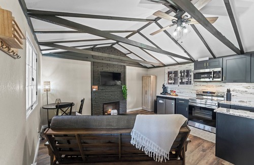 Inside, the living room provides a cozy atmosphere with an electric fireplace, a Somette Tucson futon, and a dining table ideal for two. For entertainment, enjoy a selection of games, books, and a 42" Smart Fire TV. The bedroom features a 10-inch Green Tea Memory Foam Queen-Size Mattress and blackout shades, ensuring a restful and rejuvenating night’s sleep.