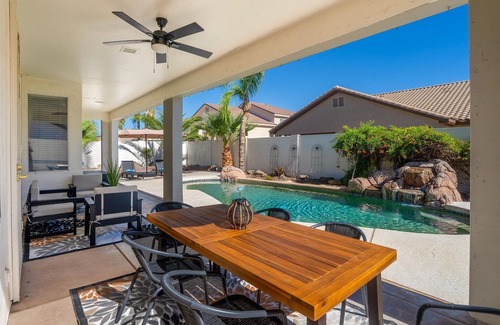 Welcome to your perfect Arizona getaway—nestled in Chandler on the border of Gilbert. This spacious 4Bed/3Bath retreat comfortably sleeps up to 10 guests and is designed for both relaxation and play. Dive into sunny days in your private pool, unwind in a serene outdoor lounge, or challenge your crew to game night with activities for every age. Whether you're here for family fun, a reunion, or a sun-soaked escape, this desert oasis delivers the ideal blend of comfort, style, and entertainment.